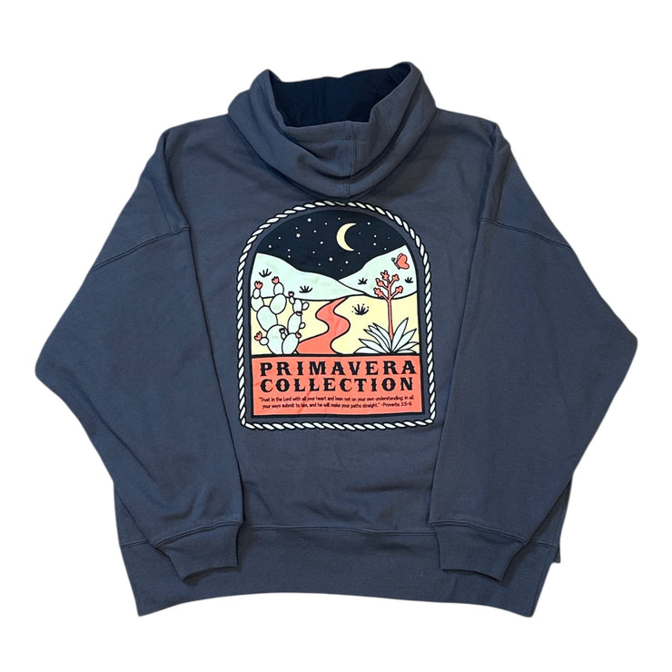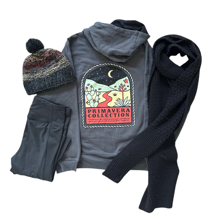 Constructed of 55% cotton, 45% polyester, nearly 9 ounce, sueded fleece, our newest Primavera Collection sweatshirt features a desert sunrise scene that is perfect for everyday wear. Long sleeves with a set on pouch pocket, ribbed cuffs, as well as a jersey lined hood. We also love the split seam and that it's slightly longer in the back than the front.